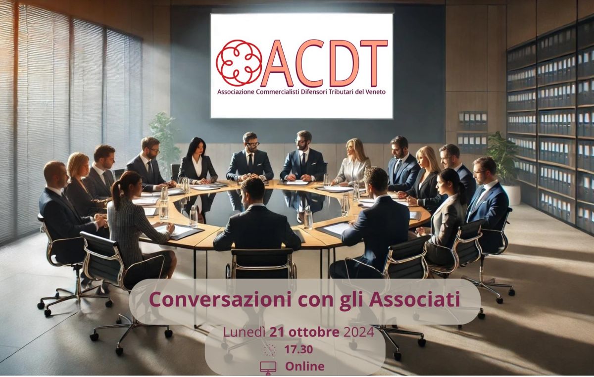 Parte il nuovo ciclo “Conversazioni con gli Associati” dell’ACDT – Associazione Commercialisti Difensori Tributari del Veneto, uno spazio agile e operativo pensato per i difensori tributari del territorio. Primo appuntamento: lunedì 21 ottobre 2024 alle ore 17:30, in modalità online.