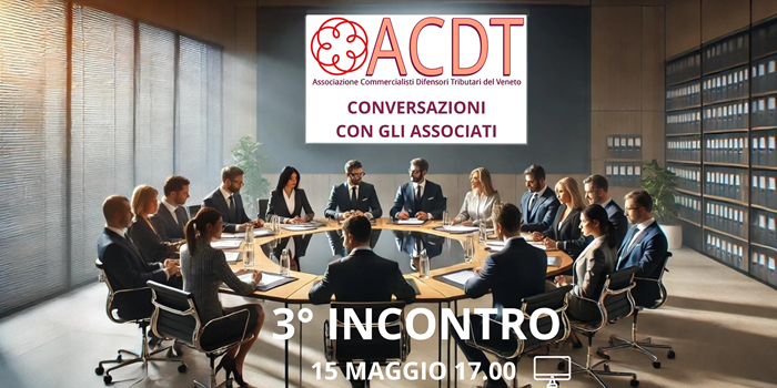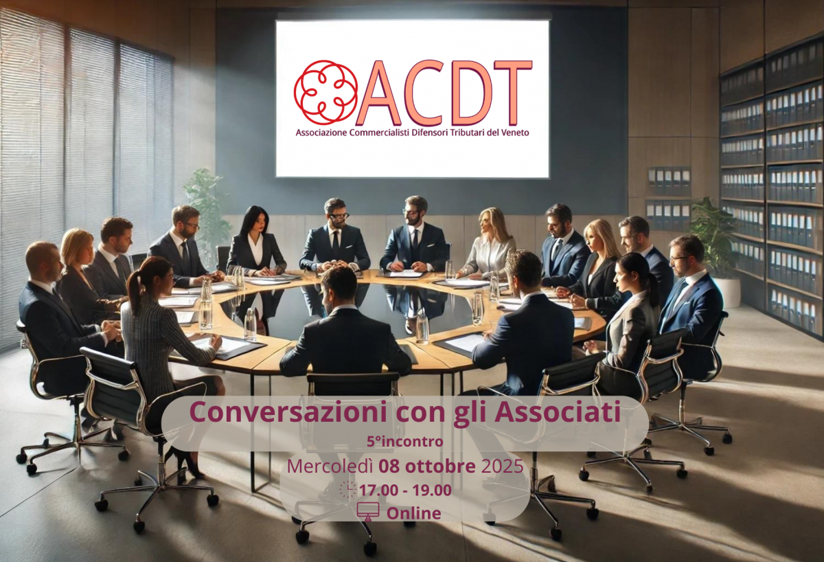 Prosegue il percorso di studio e confronto promosso dall’Associazione Commercialisti Difensori Tributari del Veneto (ACDT) con il quinto appuntamento delle “Conversazioni con gli Associati”, in programma mercoledì 8 ottobre 2025, dalle ore 17.00 alle 19.00, in modalità online.