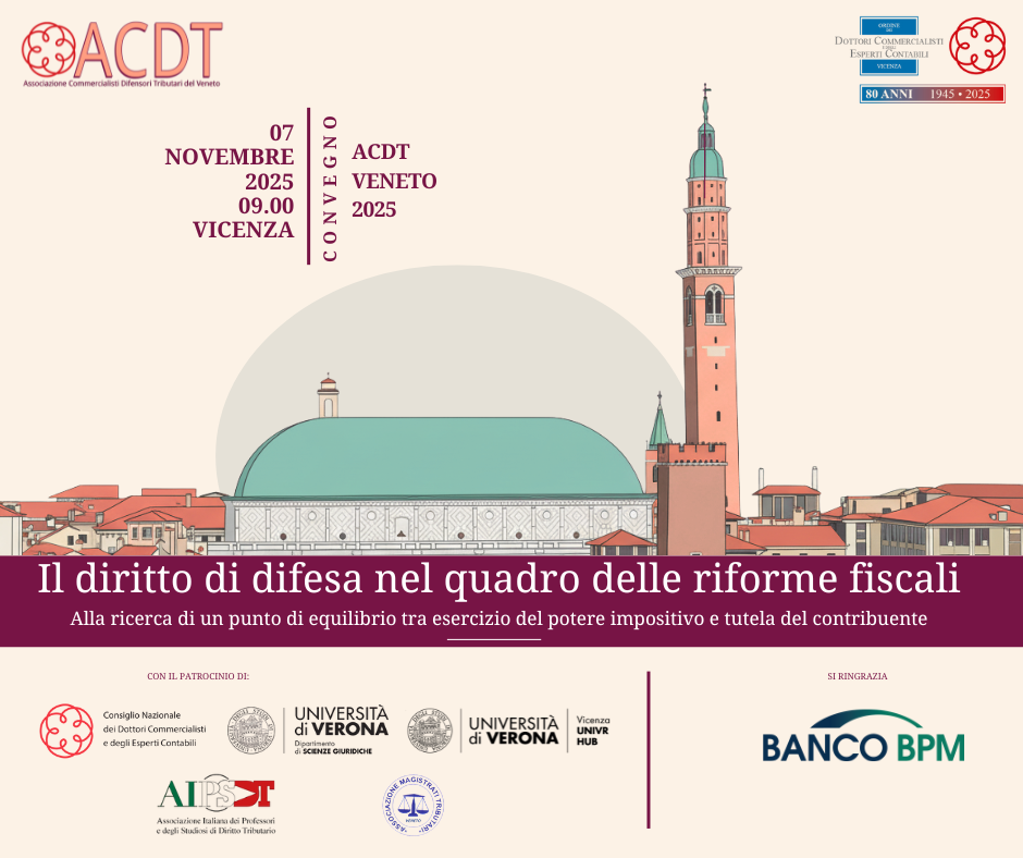 Venerdì 7 novembre 2025 Vicenza ospiterà il primo convegno dell’ACDT – Associazione Commercialisti Difensori Tributari del Veneto. Si tratta di una giornata di studio e confronto, in collaborazione con l’Ordine dei Dottori Commercialisti e degli Esperti Contabili di Vicenza, dedicata al rapporto tra potere impositivo e tutela del contribuente alla luce delle riforme fiscali in corso.